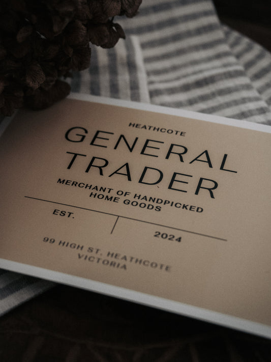 The perfect gift for lovers of thoughtful design, natural materials and handcrafted charm. Let your recipient choose from our curated range of fine art prints, vintage finds, homewares, textile, and more. Whether it's for a birthday, a housewarming or simply to say thank you, a Heathcote General Trader Gift Card is a beautiful way to share something special.
